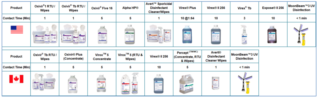 Diligent environmental cleaning and disinfection and safe handling of potentially contaminated materials is essential. The following Diversey disinfectants have been tested and shown to be efficacious against strains of Adenovirus, as well as several other non-enveloped viruses when used in accordance with label instructions: