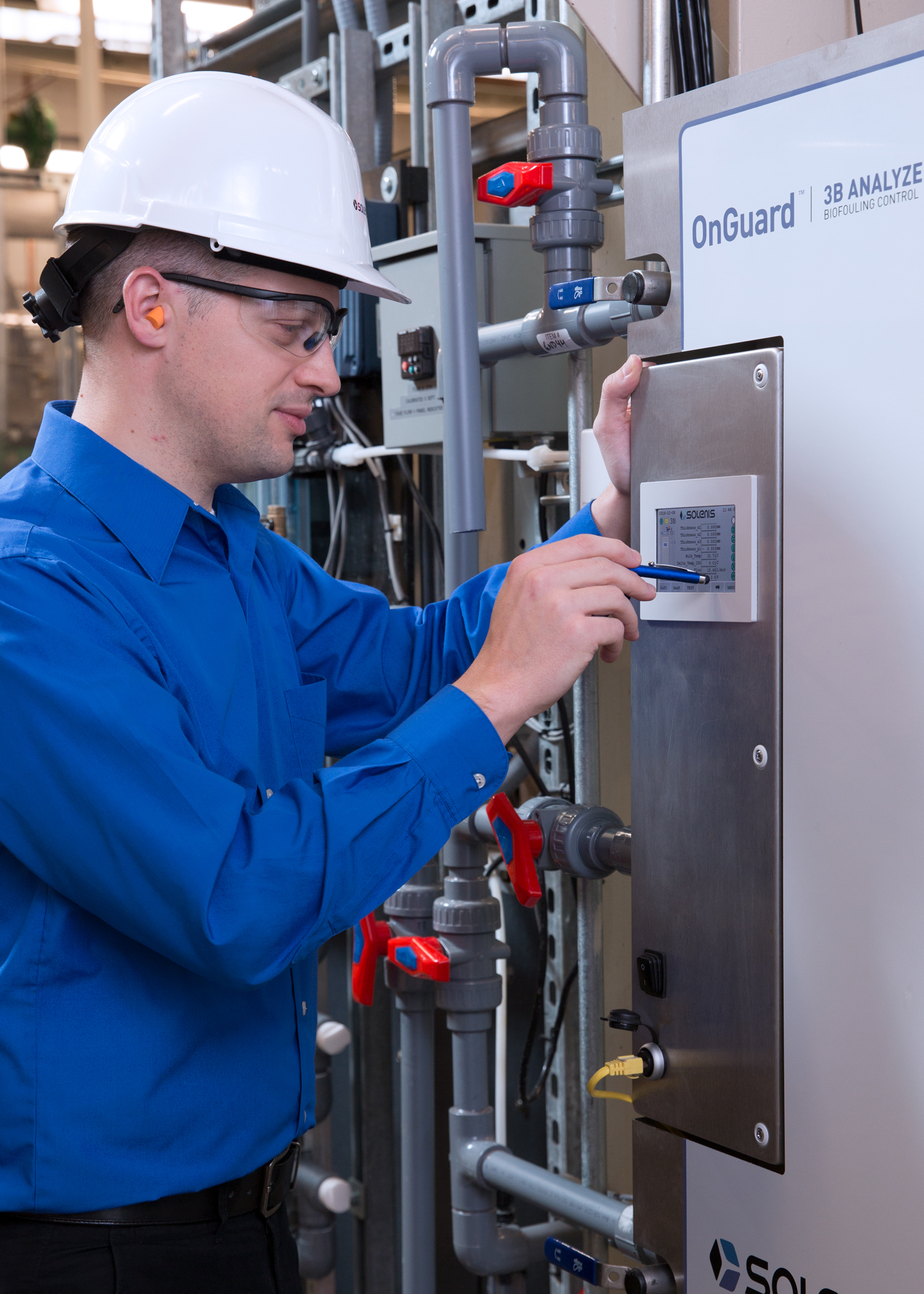 Equipment: Solenis' OnGuardTM 3B analyzer provides real-time, in-situ monitoring using an ultrasonic probe certified by the Karlsruhe Institute of Technology and the Center for Biofilm Engineering to distinguish soft organic fouling from hard scale. This exclusive Solenis technology is part of a single plug and play solution programmed to detect the earliest signs of biofilm and then release the chemistries to combat it. Designed specifically for the ClearPoint program, the OnGuard 3B analyzer joins the company's existing family of proven OnGuard monitoring and control systems installed in plants worldwide.