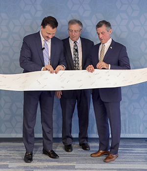 From left to right, Philip M. Patterson, Jr., Solenis Senior Vice President and Chief Financial Officer; John Panichella, President and Chief Executive Officer; and John Carney, Governor of Delaware commemorate the opening of Solenis’ new global headquarters. The paper used in the ribbon-cutting was produced by Solenis at their R&D test facility.
