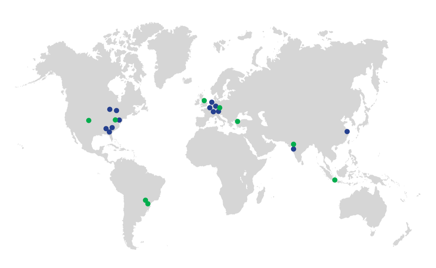Blue dots represent our R&D centers and green dots represent our Customer Applications Laboratories (CALs).