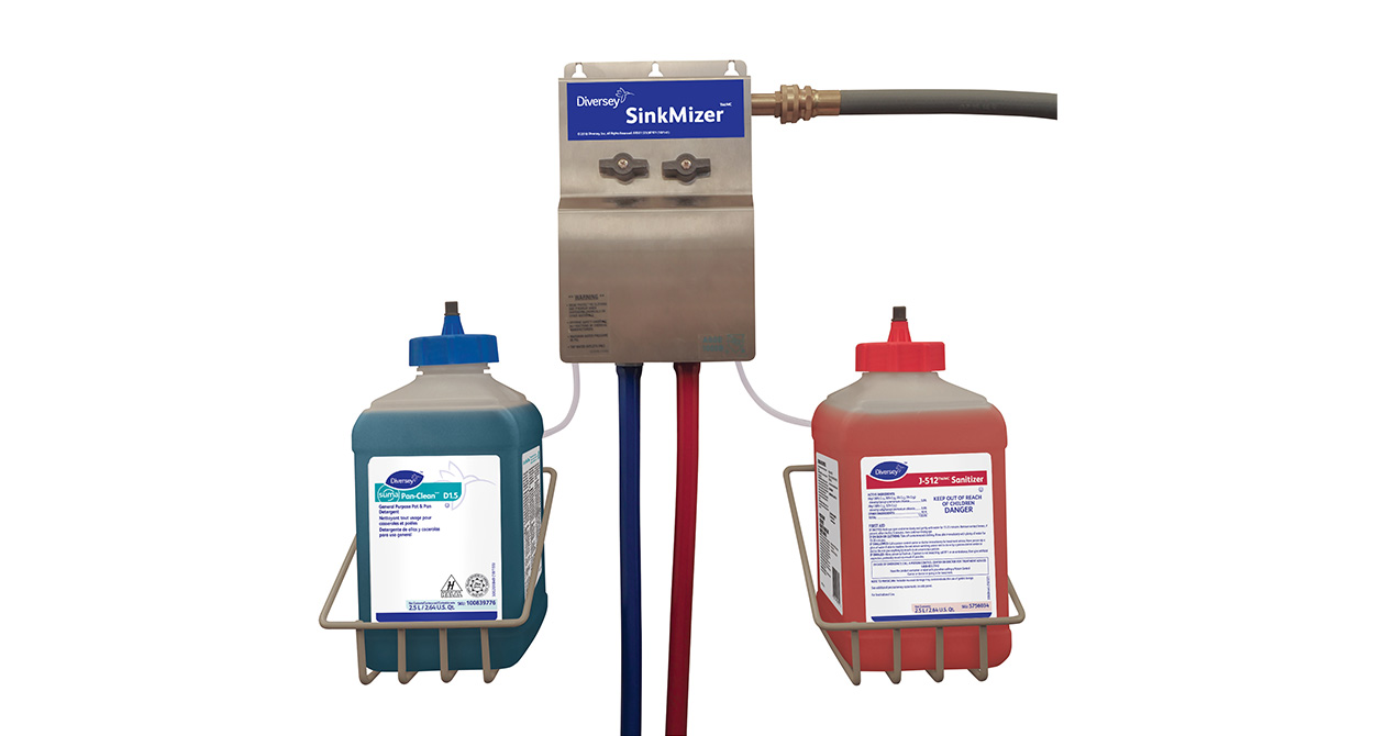 SinkMizer to montowany na ścianie dozownik do trzykomorowego zlewozmywaka. Jest przeznaczony do napełniania gotowym do użycia płynem do mycia naczyń i środkiem odkażającym.