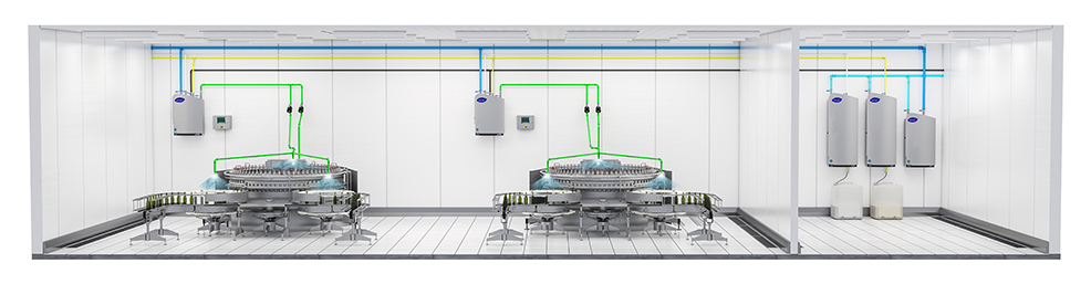 O OPC manual centralizado é ideal para as plantas em que produtos químicos concentrados não são permitidos dentro das salas de processamento. Em uma configuração centralizada, todos os produtos químicos são pré-diluídos em uma sala de produtos químicos separada e isolada e distribuídos por uma série de tubulações. Na sala de produtos químicos, a pressão da água de enxágue é aumentada por meio de uma bomba multiestágio. Cada unidade satélite OPC receberá espuma de limpeza pré-diluída, higienizante pré-diluído e água sob pressão aumentada.